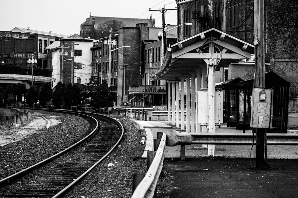 A couple points about this composition. The black and white works here because of the wide variety of different tones across the image. The white of the platform's roof structure stands out against the darker tones of the background. We also get a benefit here from the sun reflecting of the polished rails. That helps them stand out against the ballast (rocks) underneath. Besides the different tones, there are also different textures across the image, which allows the different elements to stand out. My saying when shooting black and white is, "you can never have too much contrast." For reference, here's the unmodified version of this photo: